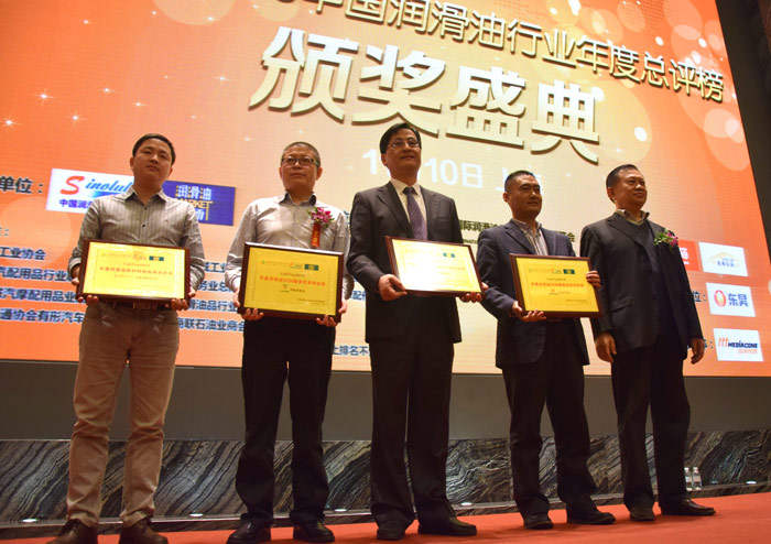 ? ? ? ??2015年11月10日,由中國潤滑油信息網(wǎng)、《潤滑油市場》雜志發(fā)起主辦,第十六屆中國國際潤滑油品及應(yīng)用技術(shù)展覽會聯(lián)合主辦的“LubTop2015中國潤滑油行業(yè)年度總評榜”活動中,經(jīng)過網(wǎng)絡(luò)公眾投票、專業(yè)市場調(diào)研、專家導(dǎo)師委員會嚴(yán)格評審流程,司能石油化工有限公司榮膺“LubTop2015中國潤滑油行業(yè)年度潤滑油OEM服務(wù)優(yōu)秀供應(yīng)商”稱號。司能石油化工有限公司營銷副總潘健康先生作為獲獎企業(yè)代表,應(yīng)邀出席頒獎典禮并上臺領(lǐng)獎。