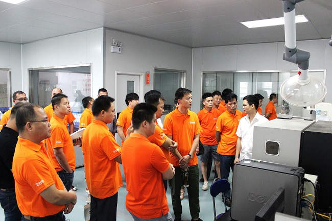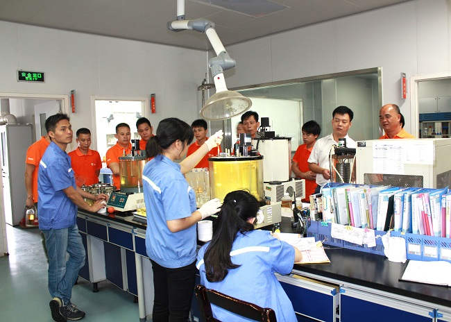 研發(fā)中心主任韋起桂帶領(lǐng)大家參觀了司能的中心實(shí)驗(yàn)室。該中心目前是廣西壯族自治區(qū)內(nèi)技術(shù)水平最高、分析手段最齊全的潤滑油分析評定中心。韋主任針對生產(chǎn)自動(dòng)化,基礎(chǔ)油采購渠道,先進(jìn)的技術(shù)檢驗(yàn)研發(fā)設(shè)備等話題與現(xiàn)場來賓們進(jìn)行了交流與探討,使之更加拉近與經(jīng)銷商、終端客戶的距離。