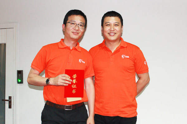 △江蘇司能總經(jīng)理賈汝濤與獲得大客戶維穩(wěn)進(jìn)步冠軍陳遠(yuǎn)銘合影。