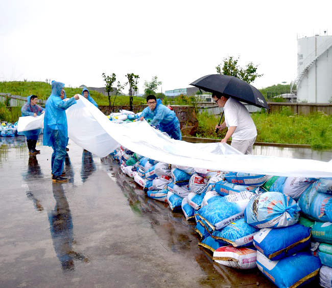 ? ? ? ? 2016年6月28日中午12時左右,溧陽地區(qū)連續(xù)強降雨使蕪申運河水位由早上8點的4.5米急速上升至5.5米,水面距離公司碼頭駁岸距離不到0.5米。發(fā)現(xiàn)這一情況,司能石化常務(wù)副總經(jīng)理吳土金立即組織和號召江蘇司能防汛抗洪小組第一時間緊急啟動一系列防汛抗洪應(yīng)急措施: